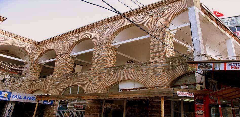 Giriş kısmı çift sıra kemerli bir kapıdan olup doğu tarafındandır. Girişin sağından ve solundan üst kata çıkış sağlanır. Orijinal iki kanatlı kapıları da üzerindedir ve korunmuştur. Üç cepheli olan handa,alt kat ve üst kat aynı örtü sitemine sahip olarak beşik tonozlu, önünde yine çapraz tonoz örtülü revak kısmı yer almaktadır.