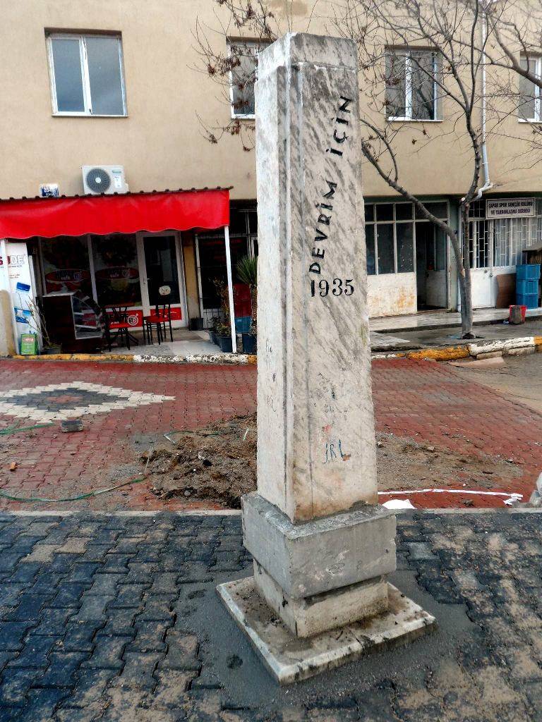 Zamanın en iyi mermer ustaları bulunup, zamanın köy muhtarı merhum Kara Mehmet Tuna'nın muhtarlık döneminde yeni yapılan muhtarlık binası tamamlanması sonrasında, 1935 yılında Devrim Anıtı yaptırılıp, yeni inşa edilmiş olan muhtarlık binası meydanı önüne diktirilir.