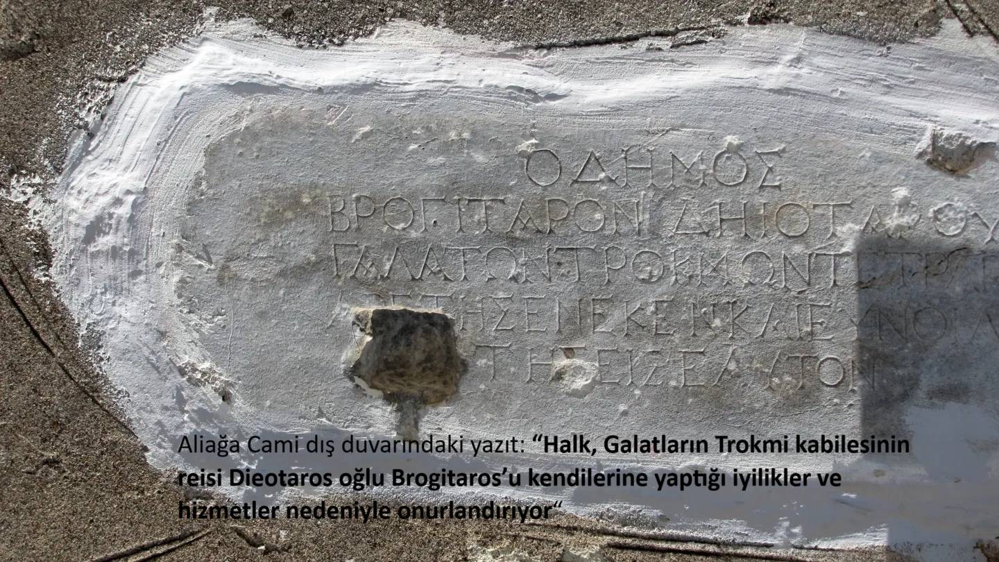 Yine caminin dış duvarında yer alan inşaat sırasında devşirme olarak kullanılan Yunanca yazıtta Galatlar’dan bahsedilmektedir. Arkeolog Prof. Ersin Doğer’e göre caminin güney yüzünde pencere altında yer alan yunanca metin ve tercümesi;