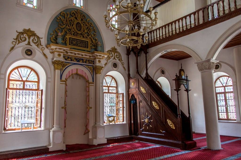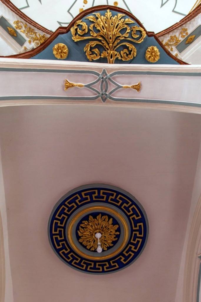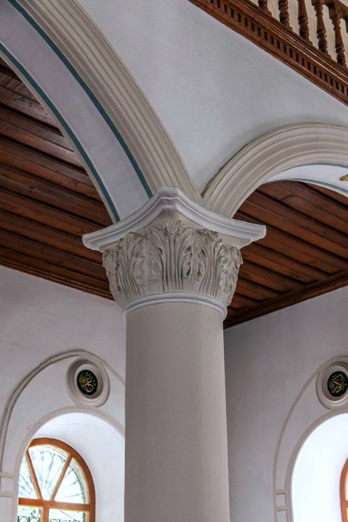 Ayrıca kuzey cephede yer alan harim girişinin kemer köşeliklerinde bulunan karşılıklı ay yıldız motifleri ve kemerin kilit taşındaki kenger yaprağı motifi kuzey cephedeki dikkati çeken süslemelerdir. Yapının içindeki süslemeler mihrapta ve mihrap önü kubbesinde yoğunlaşmaktadır. Kubbeyi taşıyan ahşap sütunlar kenger yapraklarından meydana getirilmiş korint başlıklara sahiptir. Pandantif geçişlere sahip kubbe eteğinde yer alan balkon, alçı malzemeli dekoratif konsollarda taşınmaktadır. Ayrıca bu bölümde kıvrım dallardan meydana gelen çiçek buketleri bulunmaktadır. İçerden daire eklindeki kasnağın üzerine eşit aralıklarla yerleştirilen korint başlıklı yüzeysel sütunlar kubbeye zengin bir görünüm kazandırmaktadır. Kubbe merkezinde kenger yapraklarından meydana gelen bir göbek bulunmaktadır. Ayrıca kubbenin içi geometrik şekilli alçı bezemelerle süslenir. Kubbe eteğinde ise antik etkili yumurta friz bulunmaktadır.