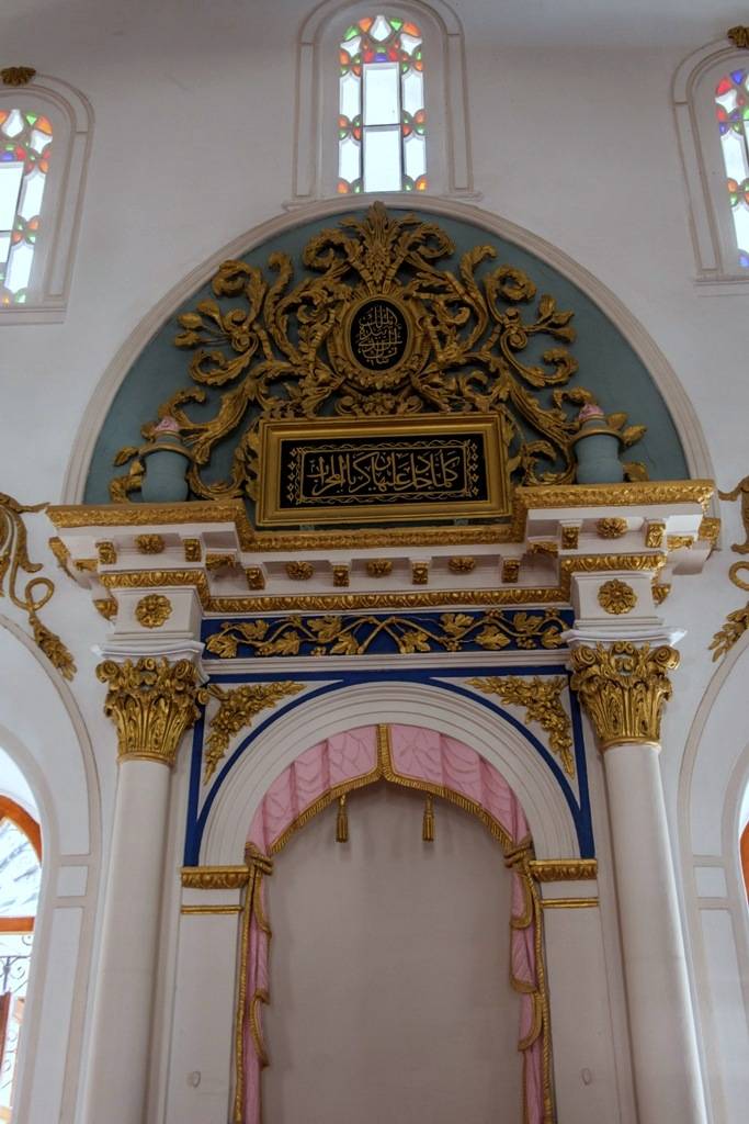 Yuvarlak kemerli ve perde motifli mihrap köşelikleri çiçek buketleri ile süslenmiştir. Mihrap nişinin iki yanında kare kesitli kaideler üzerinde yükselen kompozit başlıklı dekoratif sütunlar bulunmaktadır. Düz silmelerden meydana gelen mihrap tepeliği dekoratif konsolla da taşınmaktadır. Mihrap tepeliğinin üzerinde ise atnalı kemer şeklinde ikinci bir tepelik bulunmaktadır. Tepelik içinde yazı ile bezenmiş dikdörtgen bir pano ve oval bir madalyon bulunmaktadır. Üst tepelik iri kıvrım dallar ve yapraklarla süslenmiştir. Mihrap süslemelerinin tümü alçı malzemelidir.
