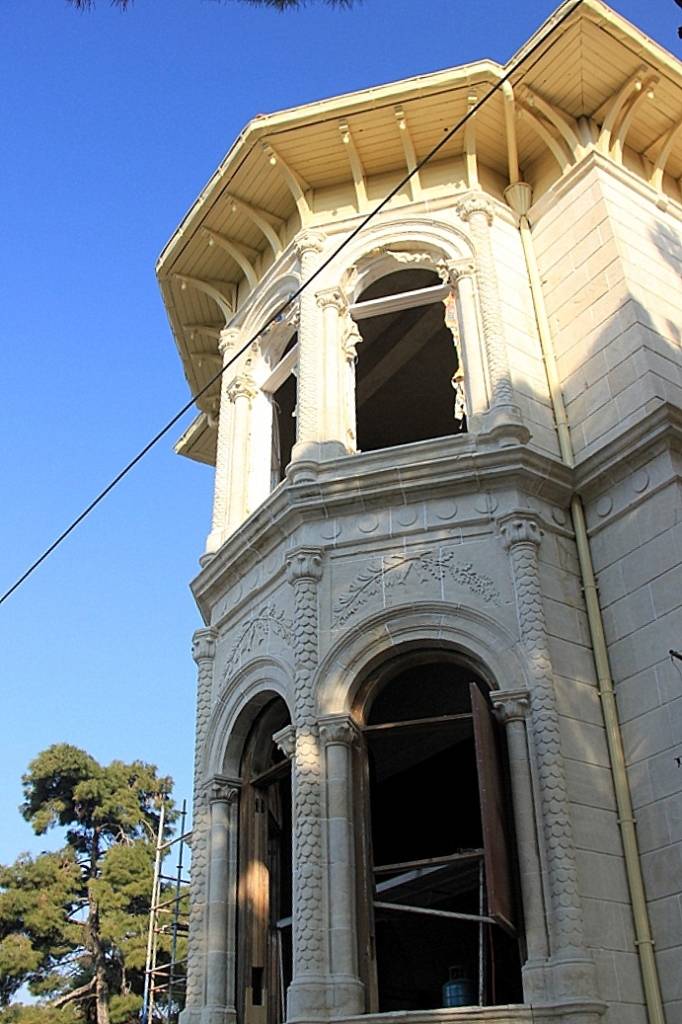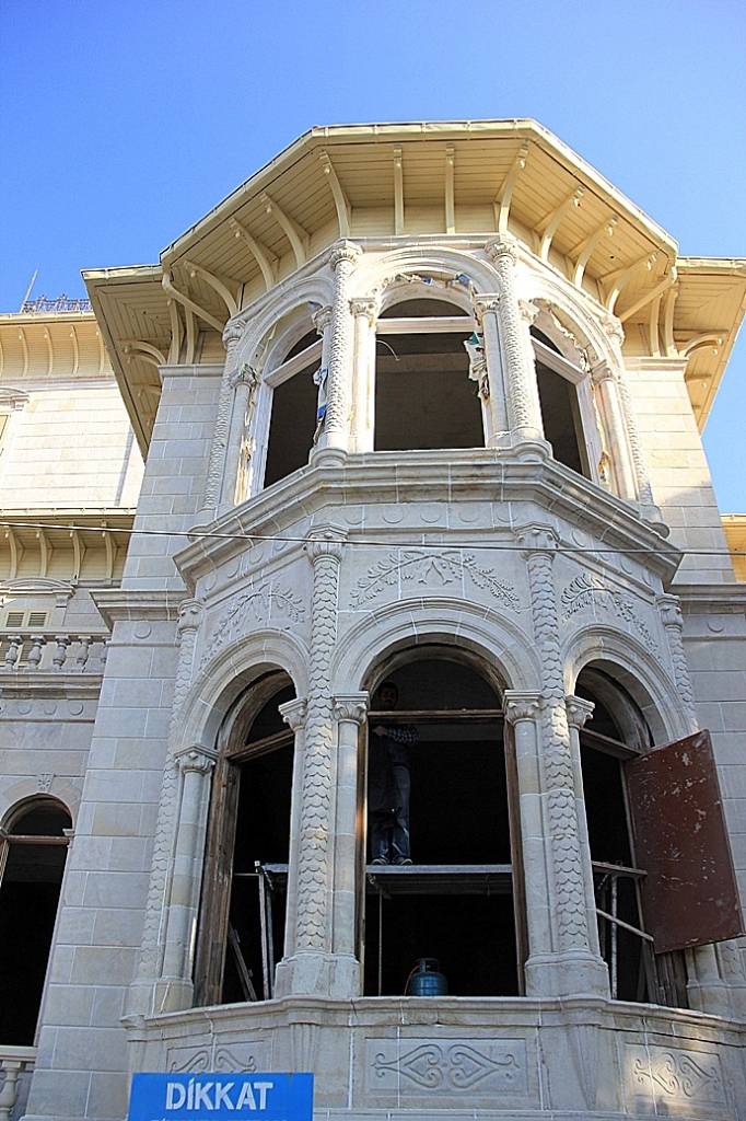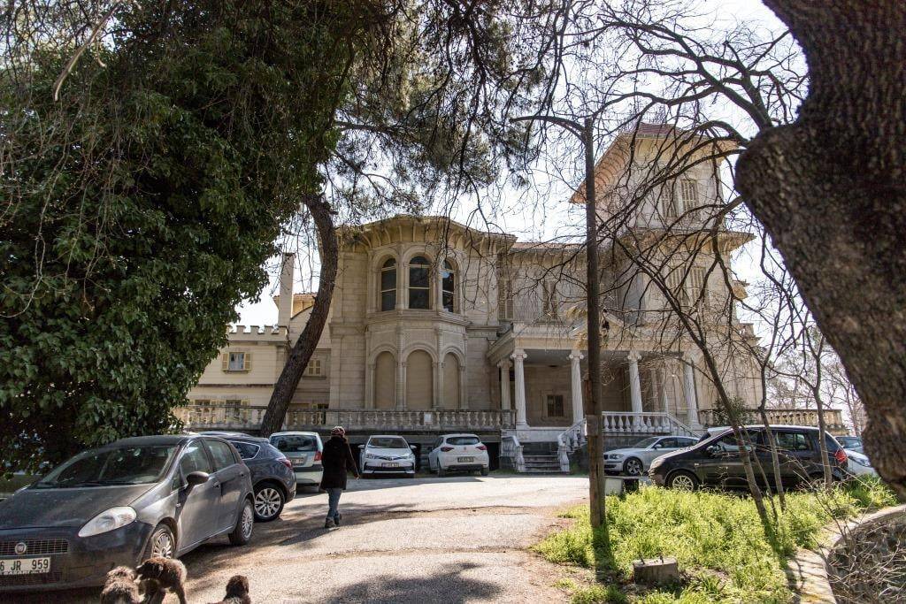 Kentsel dokunun dışında, zamanında çamlık bir koru ile örtülü tepenin üst noktasına yerleştirilmiş ve yapı formuyla tepeyi tamamlayan bir taç görünümündedir. İki kata ilaveten sivri çatısıyla yükseltilmiş ve bir kule biçimindeki köşe bloku yapıya başka bir değer katarak, çevresine egemen bir karakter vermektedir.