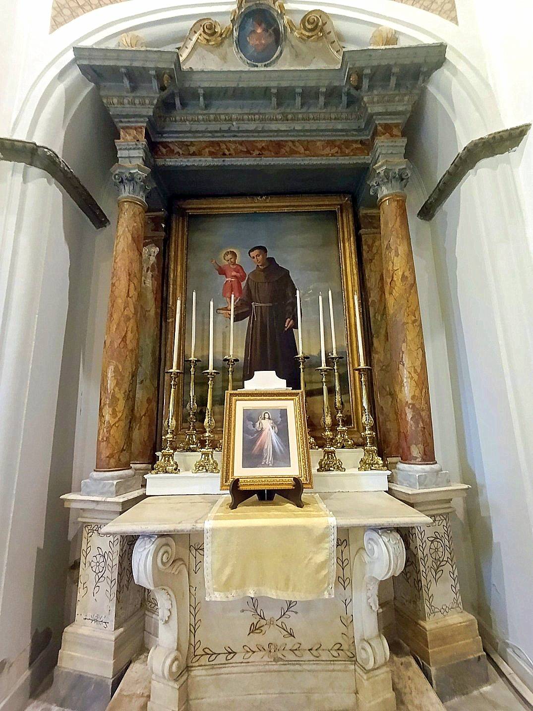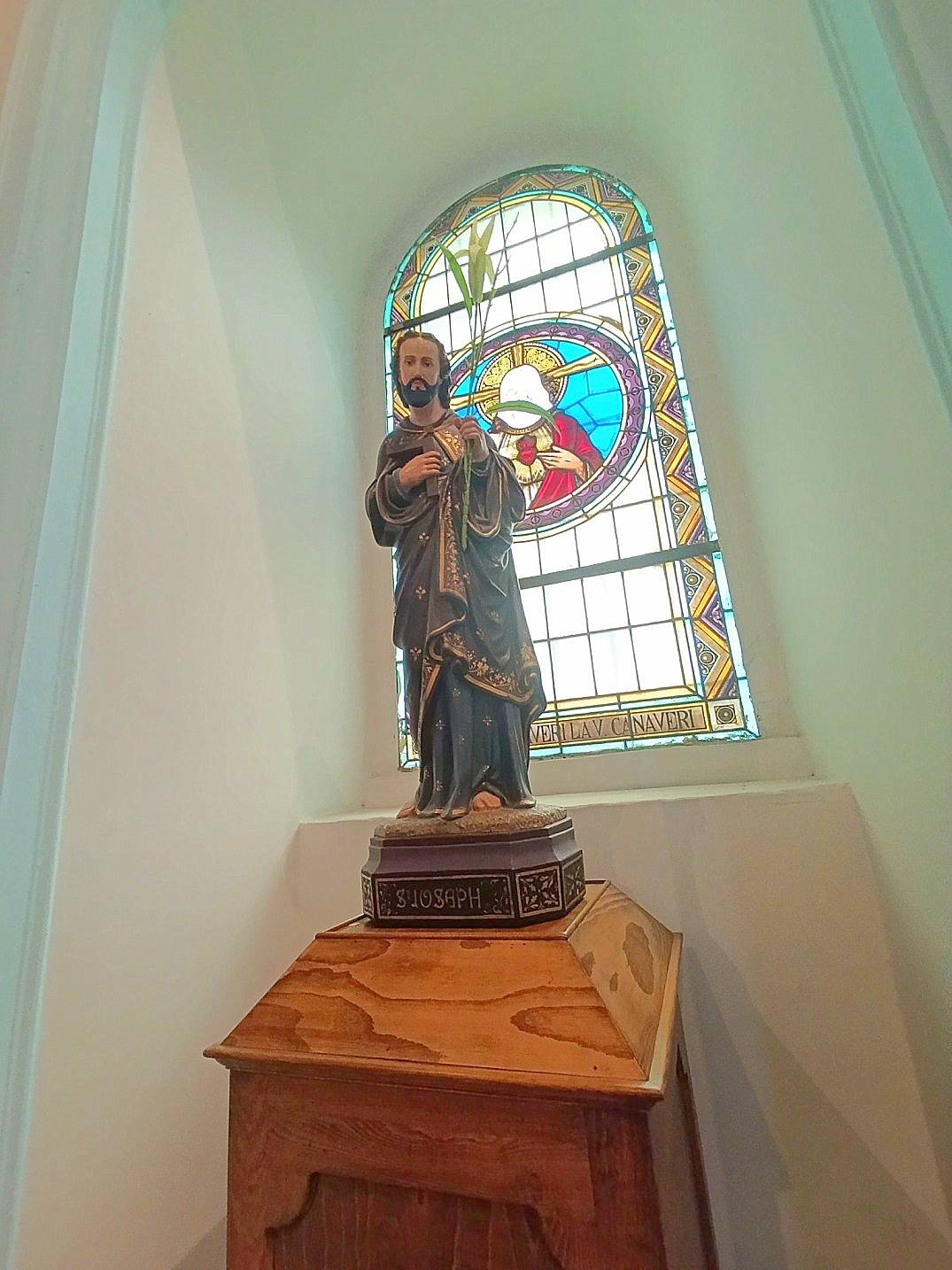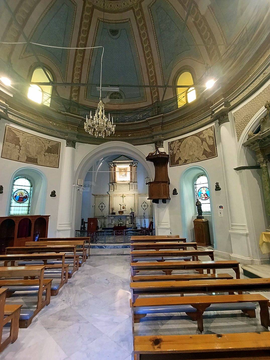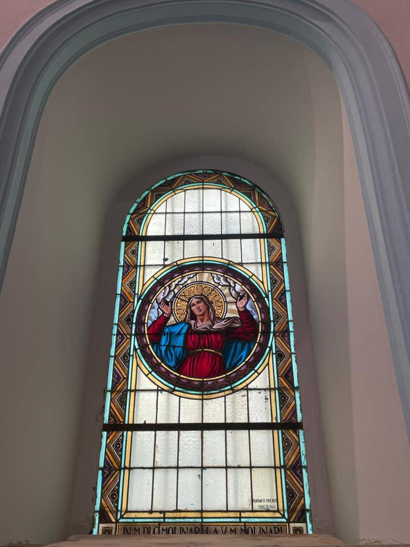 Pencerelerin üst kısımlarındaki freskler kahverengi ve krem tonlarında olup altta ise dinsel içerikli vitraylı pencereler dikkat çekicidir. Bunlardan kuzeybatı'daki pencere vitraylarında Aziz Paulus elinde kendisini simgeleyen “mektup tomarlarıyla” görünmektedir. Üst kısımdaki duvar freskinde “İsa'nın sünneti” konusu yer almaktadır. Güney batı pencere vitrayında “Hazreti İsa” üstteki freskte “Meryem'in Taç giymesi” Güneydoğu pencere vitrayında “Azize Meryem” , üstündeki freskte “ Meryem'in göğe çıkışı” kuzeydoğu'daki pencere vitrayında “ Aziz yuhanna” yani “incilci Yahya” “kendisine simgeleyen kartalla birlikte üst kesimdeki freskte ise “İsa'nın doğumu”na ait sahneler işlenmiştir. Büyük nişlerdeki kemer alındıkları geometrik desenlerle süslüdür. iç kısımlarda ise sütunların taşıdığı adeta taşlandırılmış ve dini sahnelerin yer aldığı resimler bulunmaktadır. Bunlardan batıdakinde “Aziz Francesco” doğudakinde “Aziz Antonius” ve “Çocuk İsa” tasvir edilmiştir.