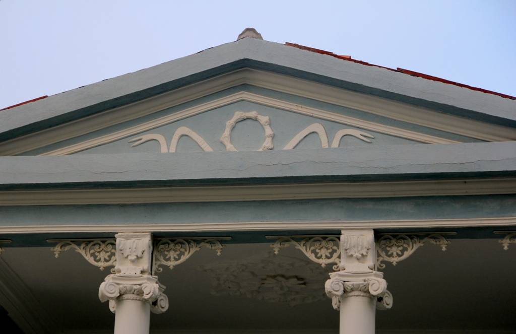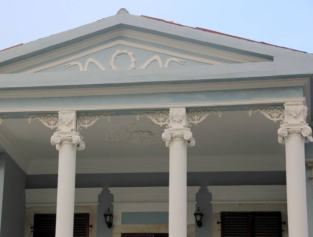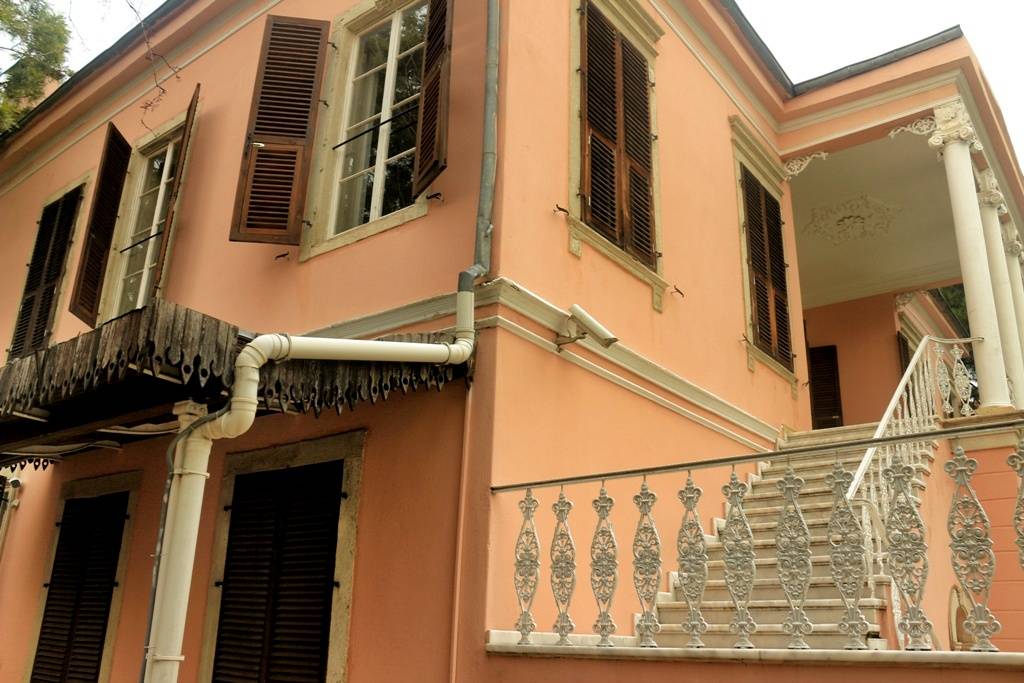 Yapının ön ve arka cephelerindeki belirgin farklılık ilginçtir. Rönesans mimari özelliklerinin izlendiği gösterişli ön cephedeki etkin unsur, çift kollu merdivenle ulaşılan, üçgen alınlık ve İyon başlıklı sütunlarla ile zenginleştirilmiş giriş portiğidir. Tuğla derzli doğal taş kolon ve kemerlerle zenginleştirilmiş verandanın yer aldığı arka cephede etkileyici sivil İtalyan mimarisi hakimdir.